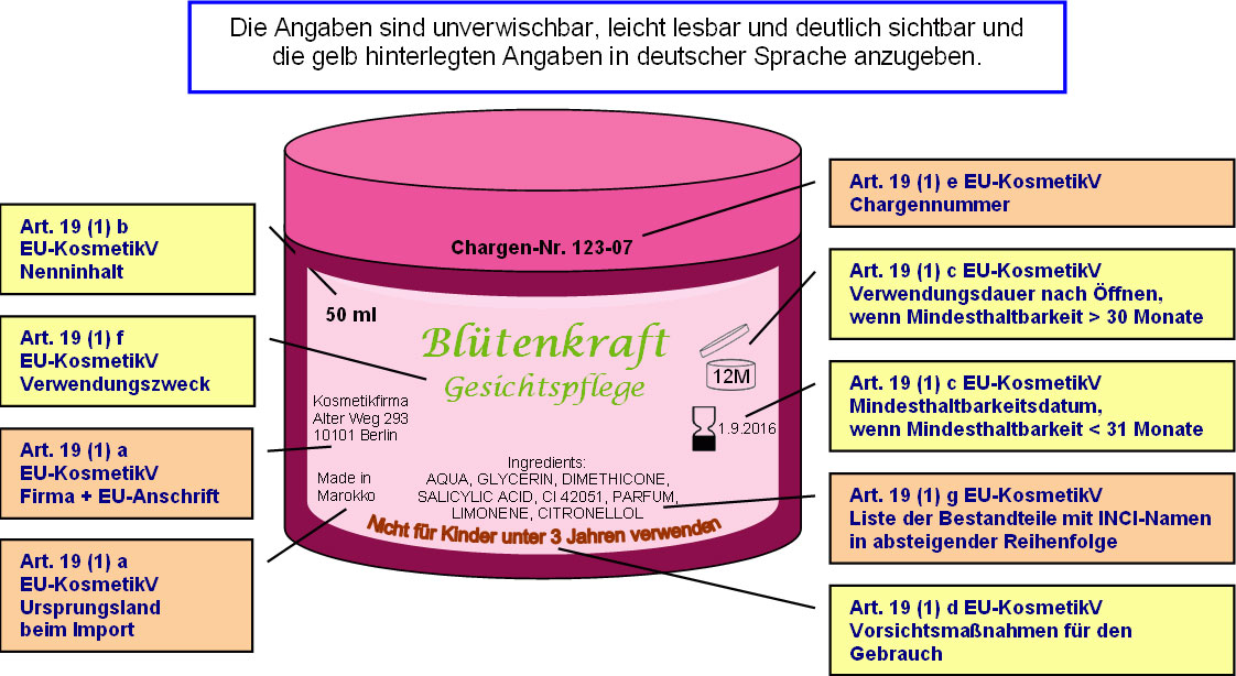 Die Behältnisse und/oder die Verpackungen müssen unverwischbar, gut leserlich und deutlich sichtbar insbesondere folgende Angaben tragen: